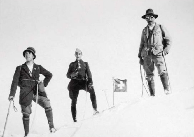 De vaillants alpinistes posent au sommet du Pigne d’Arolla en 1917.